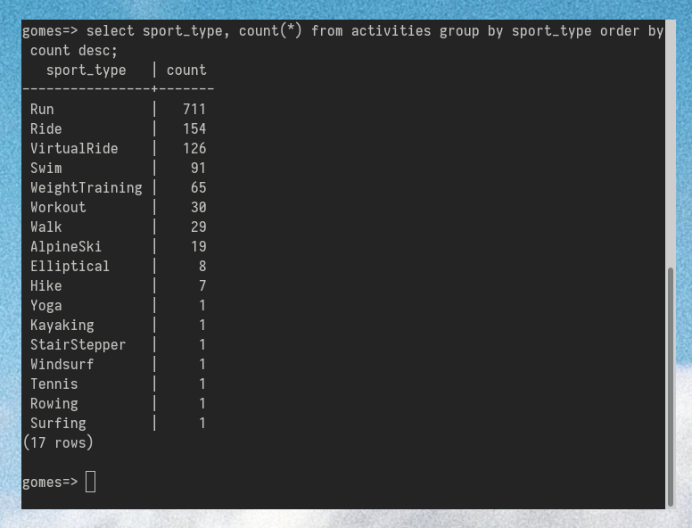 At the same time, I’d like all of my Strava data to be accessible with good old SQL. That'll be useful as well.