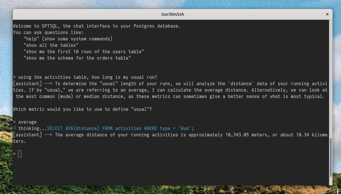 I was indeed able to ask my database some questions in plain English, such as “how long is my average run, in minutes?”: